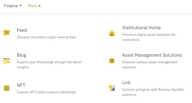 Logga in på Binance.com. Välj sedan ”Mer” i menyn och därefter ”NFT” (se bild nedan).