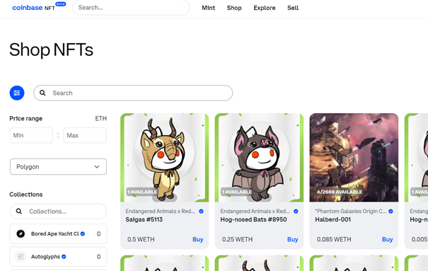 Klicka på ”Shop” i menyn och välj på vilken blockkedja du vill köpa din NFT. På bilden nedan har Polygon valts då den blockkedjan har betydligt lägre transaktionskostnader än Ethereum. Ett ytterligare alternativ är Base, dvs. Coinbase egen blockkedja.