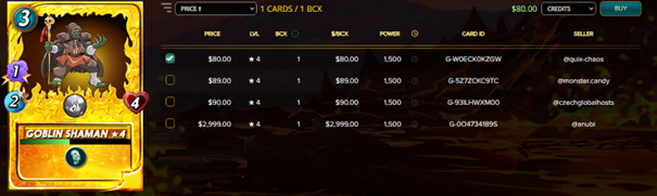 Det billigaste kortet är värderat till 80 USD och uppe till höger går det att välja att betalning ska ske i krediter. Genom att klicka på BUY-knappen blir denna NFT köpt och kommer sedan finnas tillgängligt på spelkontot.