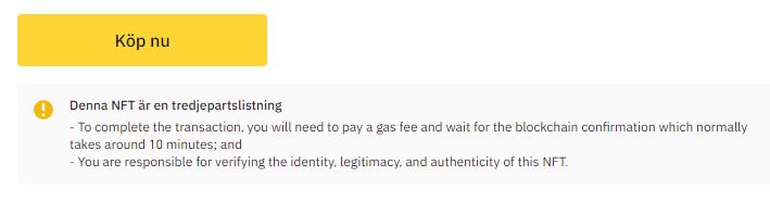 Viktigt: Tredjepartslistning innebär att en NFT finns tillgänglig på en annan NFT-plattform men listas hos Binance för försäljning. I detta fall behöver Binance ta ut en nätverksavgift för att kunna flytta ägandeskapet vid handeln.