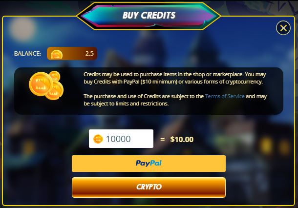 På bilden nedan önskas 10 000 Credits köpas i NFT-spelet Splinterlands. Detta kostar 10 USD. Betalning kan ske med PayPal eller krypto.