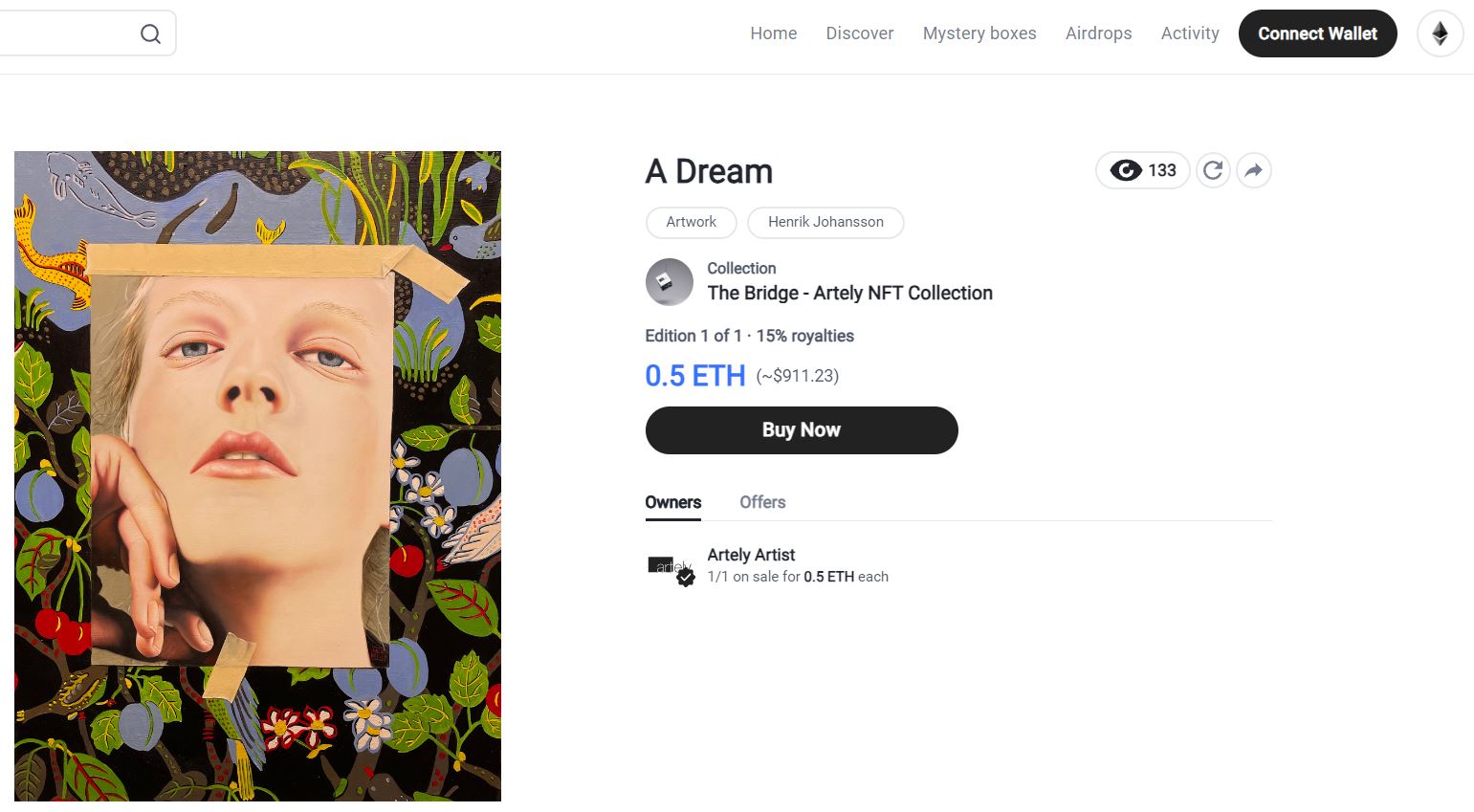 Du kommer nu till deras NFT-plattform som på flera sätt har likheter med övriga NFT-plattformar utifrån teknik och funktion. På plattformen presenteras varje NFT med pris, konstnär, kollektion med mera. Se bild nedan på konstverket ”A Dream” av Henrik Johansson.