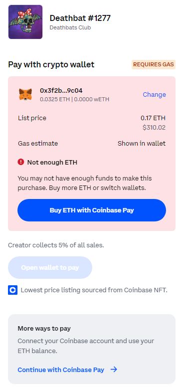 Saknas det saldo finns möjligheten att först köpa in Ether, med kortköp, via tredjepartslösningen MoonPay. Ett alternativ är att skicka Ether till adressen från en kryptobörs eller annan plånbok. Därefter kan köpet genomföras och transaktionen godkännas i ansluten kryptoplånbok.