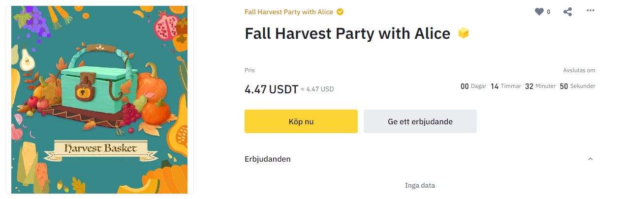- Listning på Binance – Om den NFT du vill köpa är listad hos Binance tillkommer inte någon extra kostnad. Du kan se att den är listad hos Binance genom att köpinformationen ser ut som på bilden ovan.