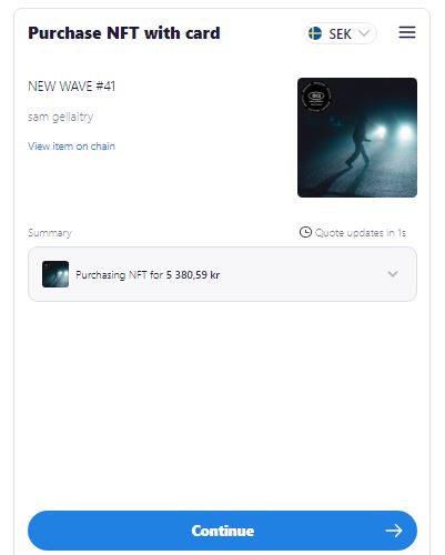 Det som sker i praktiken är att MoonPay köper kryptovaluta för kortbetalningen och överför dessa direkt till den blockkedjeadress som tillhör den person som säljer sin NFT. Du betalar med kort men mottagaren får kryptovaluta. Kortbetalningen innefattar både kostnaden för den NFT som ska köpas samt eventuell nätverksavgift (gasfee) som betalas på blockkedjan.