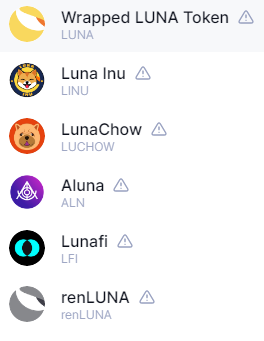 När en kryptovaluta växer och blir framgångsrik skapas både ” kopior”, bedrägerier med liknande namn samt wrapped tokens. Som nybörjare kan det vara lätt att förväxla dessa med originalet. Bilden nedan är från decentraliserade börsen Uniswap och exempel på valutor med liknande namn.