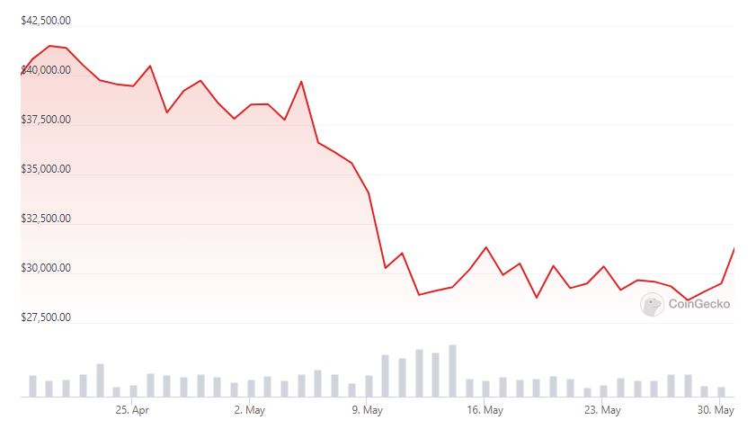 Den 9:e maj 2022 föll bitcoin från cirka 34 000 USD till cirka 30 000 USD. Ett fall på över 10 % som dessutom kom efter kraftiga ras under dagarna innan, se bild nedan. På två veckor föll kryptovalutan med 25 % i värde vilket påverkade hela kryptovamarknaden. Många ”ville ut ur marknaden” och sålde till fiat för att säkra upp sina tillgångar.