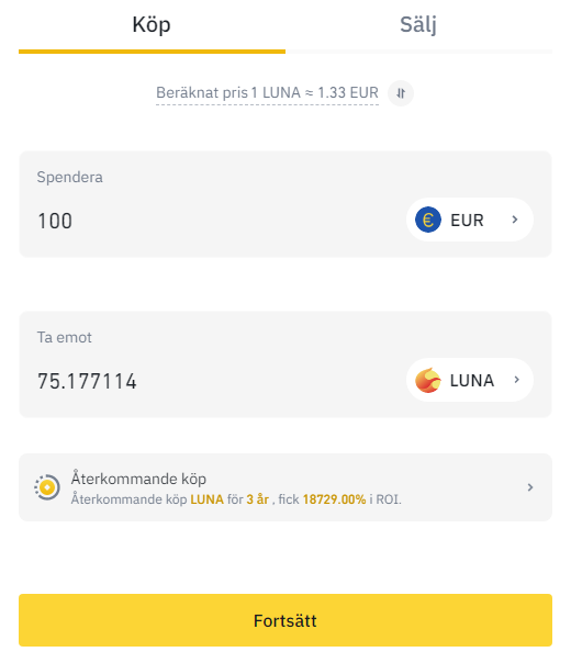 Enklaste sättet att köpa Terra Luna Classic (LUNC) eller Terra 2.0 (LUNA) är via internationella kryptobörser, exempelvis Binance. Det går inte att köpa dessa kryptovalutor hos svenska kryptobörser.