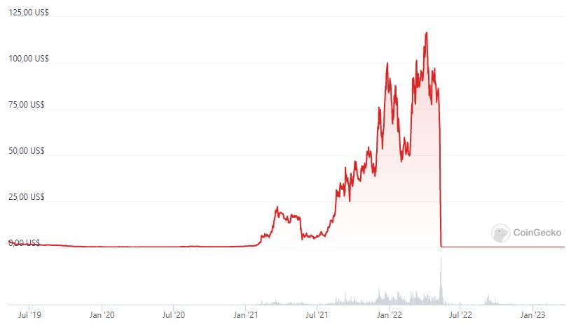 Den stora priskollapsen, som uppstod i maj 2022, kan i korthet förklaras med att dess viktigaste stablecoin, UST, inte kunde bibehålla sin pegg. Med pegg menas det värde som en stablecoin förväntas vara på.