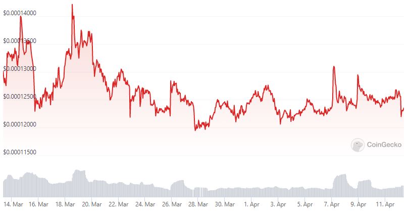 Bilden nedan visar kursen på LUNC mellan 14:e mars och 14:e april 2023. Som visas är volatiliteten mycket stor. Detta med kursförändringar på över 10 % på bara någon dag.
