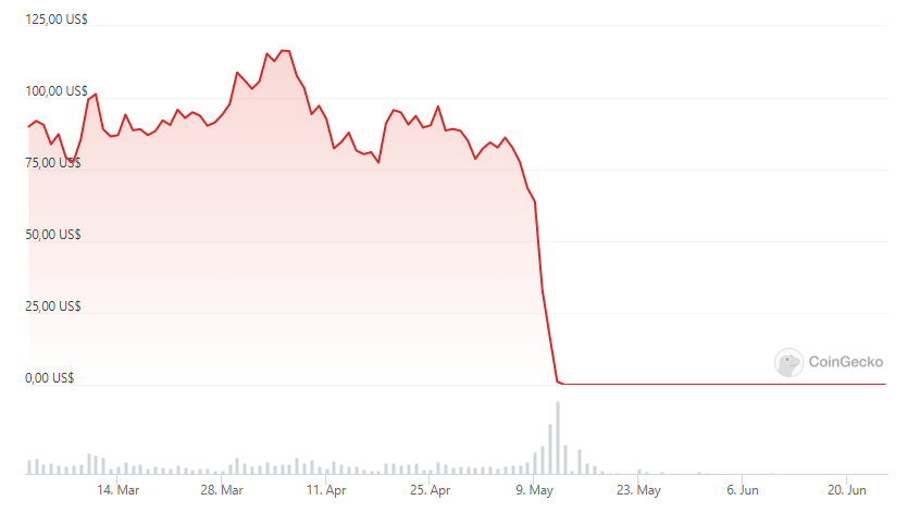 Den 9:e maj tappade UST sin pegg mot USD vilket skapade kraftig oro på marknaden. På några dagar kollapsade Terras ekosystem. Värdet på både LUNA och UST föll, bara på en dag, över 95%.