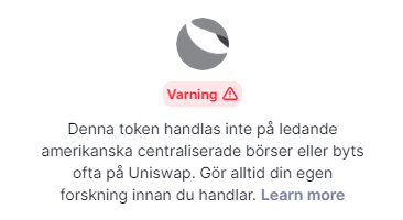 Att det är en varningstriangel bakom betyder att Uniswap kommer att visa en varningstext när växling önskas ske mot dessa valutor. En text som varnar för att dessa tokens inte säljs på amerikanska centraliserade börser och att omsättningen är låg.