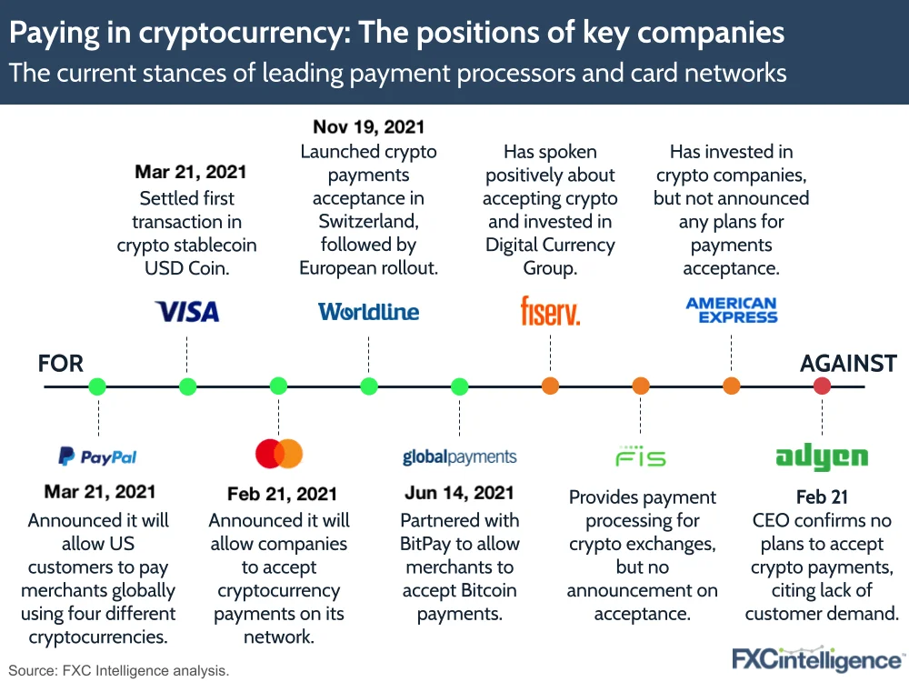 Se hur de ledande betalningsbehandlarna ställt sig till betalningar i kryptovaluta under 2021 och vilka som fortfarande diskuterar att göra det.