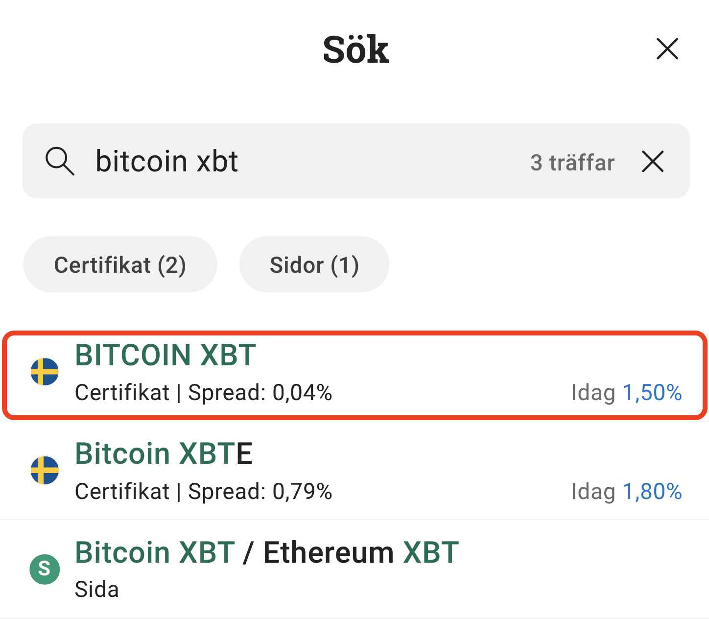 När du har pengar på ditt konto är du redo för att göra din första investering. Sök och välj valfri produkt. För detta exempelvis väljer vi att söka efter ”Bitcoin XBT” som ger oss exponering mot bitcoin.