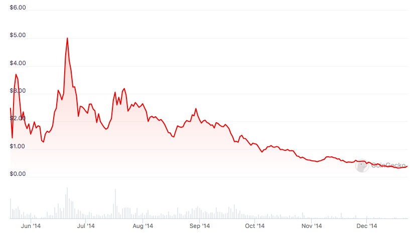 Fram till mitten av 2025 har kursen som lägst varit på 0.216177 USD. Det skedde den 13:e januari 2015.