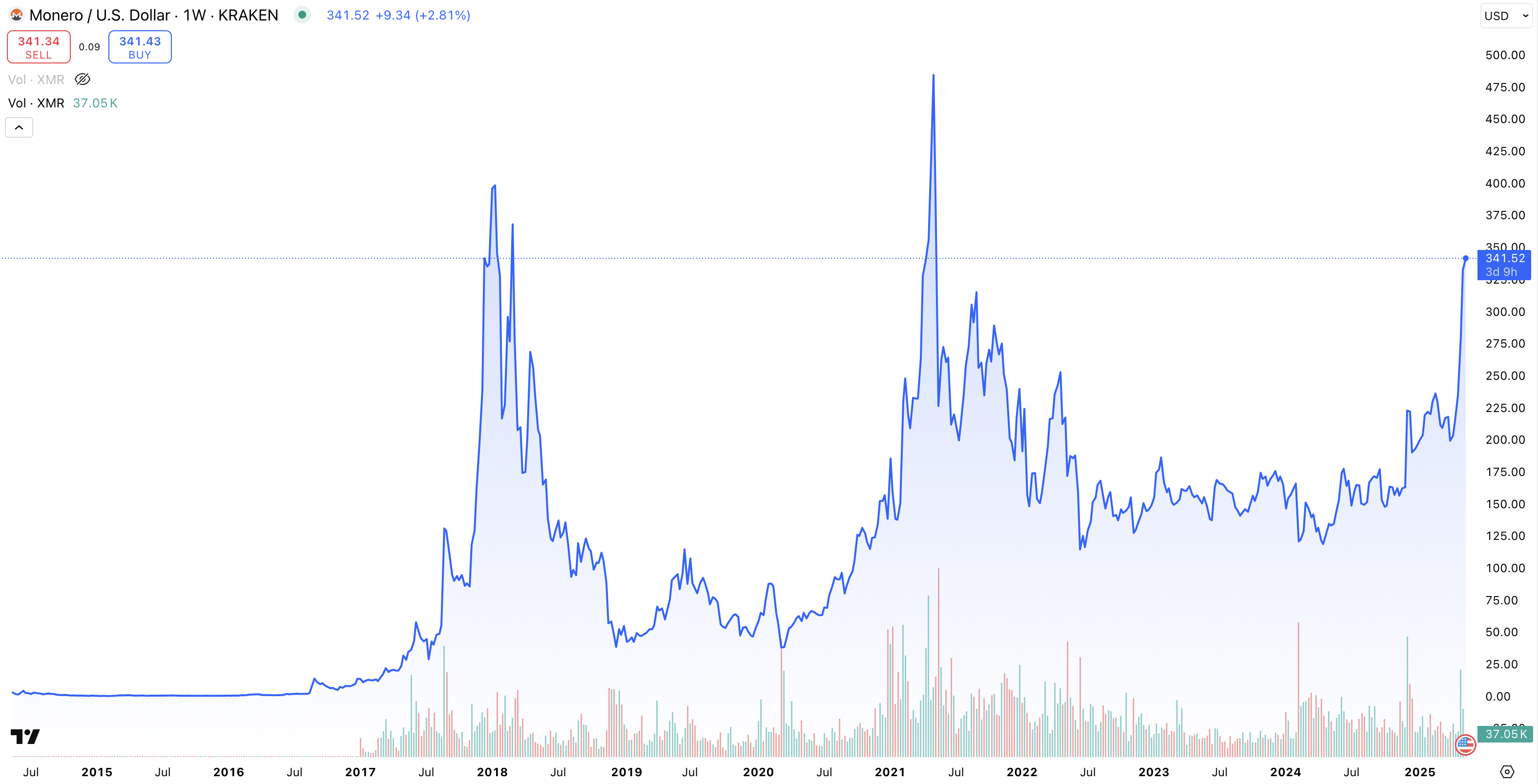 Grafen ovan visar Moneros historiska kursutveckling. Fram till mitten av 2025 har kursen som lägst varit på 0.216177 USD. Det skedde den 13:e januari 2015. Kursen har som högst uppgått till 542.33 USD. Det skedde den 8:e mars 2018. Den totala kursutvecklingen för Monero uppgick till 20 534 % mellan 2014 och 2025.