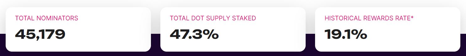 På Polkadots hemsida finns aktuella siffror kring exempelvis antalet validators och nominators. Dessutom går det att se hur stor andel av alla DOT som är låsta inom staking och därmed kan användas för denna valideringsfunktion.
