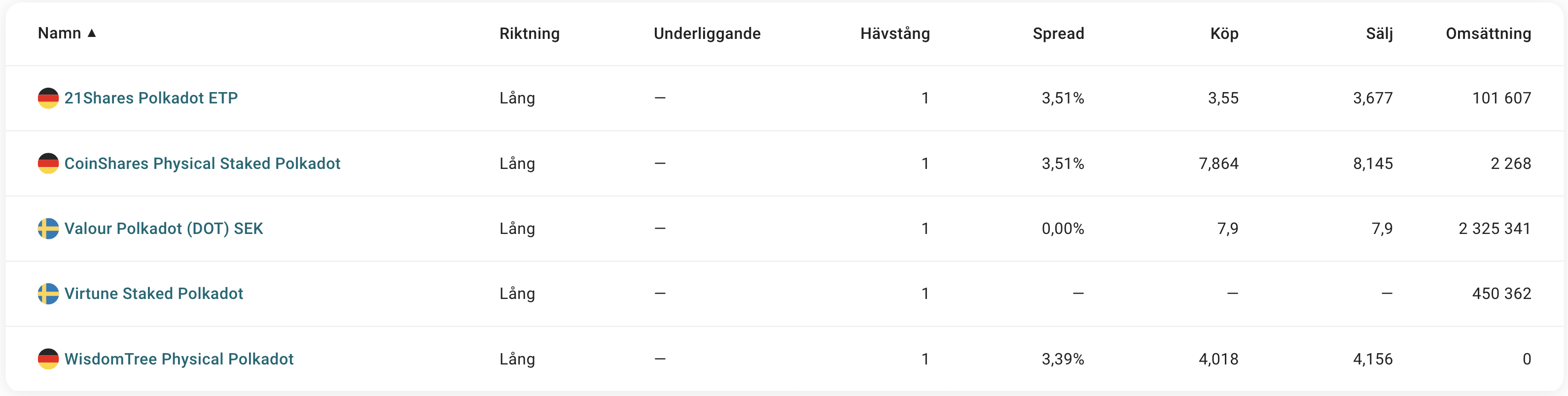 Flera värdepappersbolag erbjuder certifikat eller ETF:er med Polkadot som underliggande tillgång. Det innebär att dessa företag behöver exponera lika stort kapital mot denna kryptovaluta. Att exempelvis WisdomTree, CoinShares och Valour erbjuder certifikathandel ökar efterfrågan på kryptovalutan.