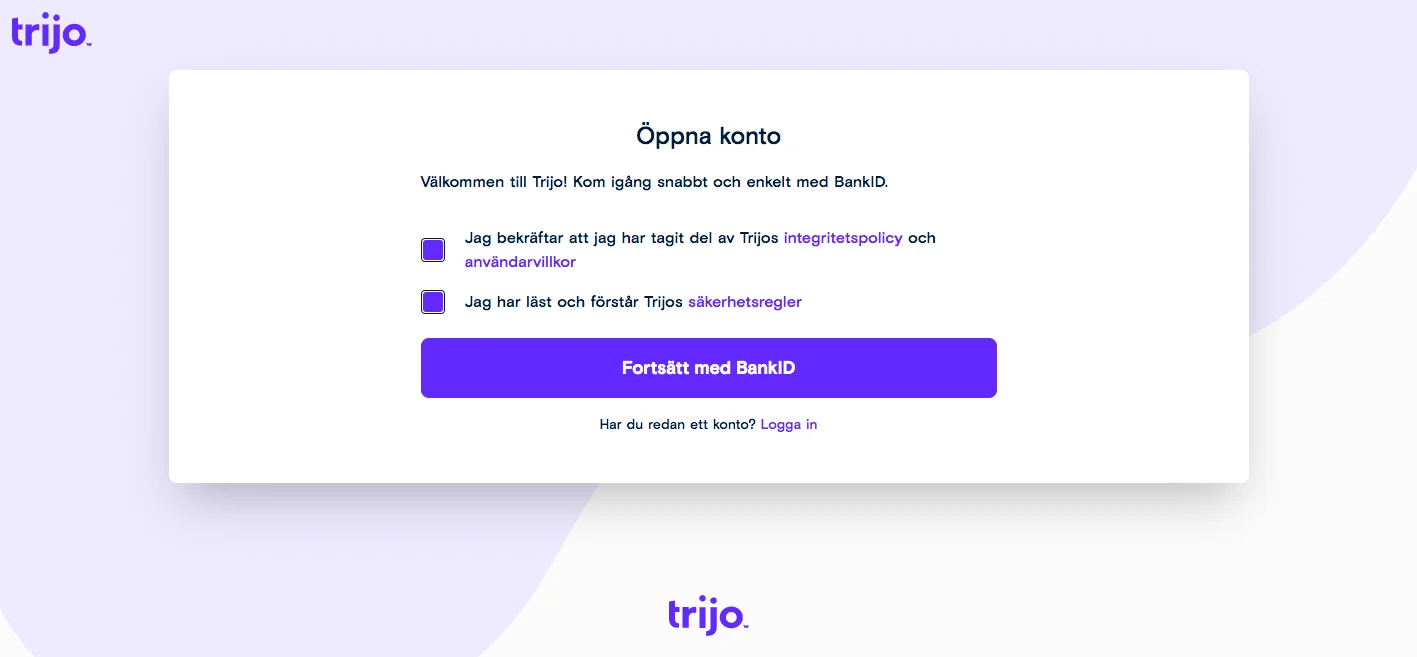 Första steget är att öppna ett konto på Trijo. Besök deras webbplats eller följ den här länken och klicka på knappen ”Skapa ett konto” →