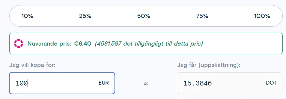 Att köpa kryptovalutan, DOT, innebär att du äger tillgången. Det går att köpa DOT både på svenska och utländska börser. Därefter kan du välja mellan att ha kvar kryptovalutan på börsen eller skicka den till en egen kryptoplånbok eller ett projekt inom Polkadot.
