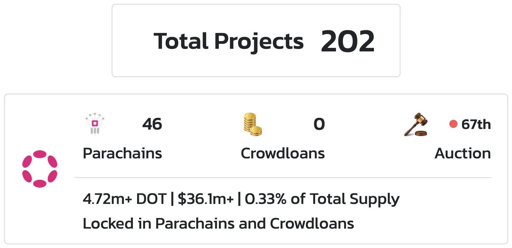 Hur stor efterfrågan är på dessa parachains avgör därmed även efterfrågan på DOT. På Parachains.info går det bland annat att se antal projekt, aktiva parachains och crowdloans. Dessutom visas hur många DOT som är låsta i dessa parachains och dess andel av totala utbudet.