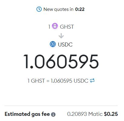 Exempel: Nedan visas en swap (växling mellan två kryptovalutor) som sker via webbplånboken Metamask. Vid ”Estimated gas fee” anges att växlingen förväntas kosta 0,2893 Matic vilket då motsvarade ca 0,25 USD.
