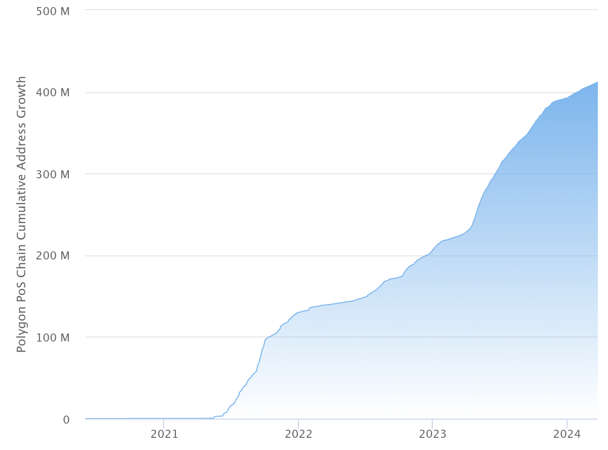 Det går även att se antalet polygonadresser via tjänsten Polyscan. Som bilden nedan visar har antalet adresser ökat stadigt, vilket är grunden för att antalet transaktioner ska kunna att öka framöver. I början av 2024 uppgick det totala antalet unika adresser till över 400 miljoner.