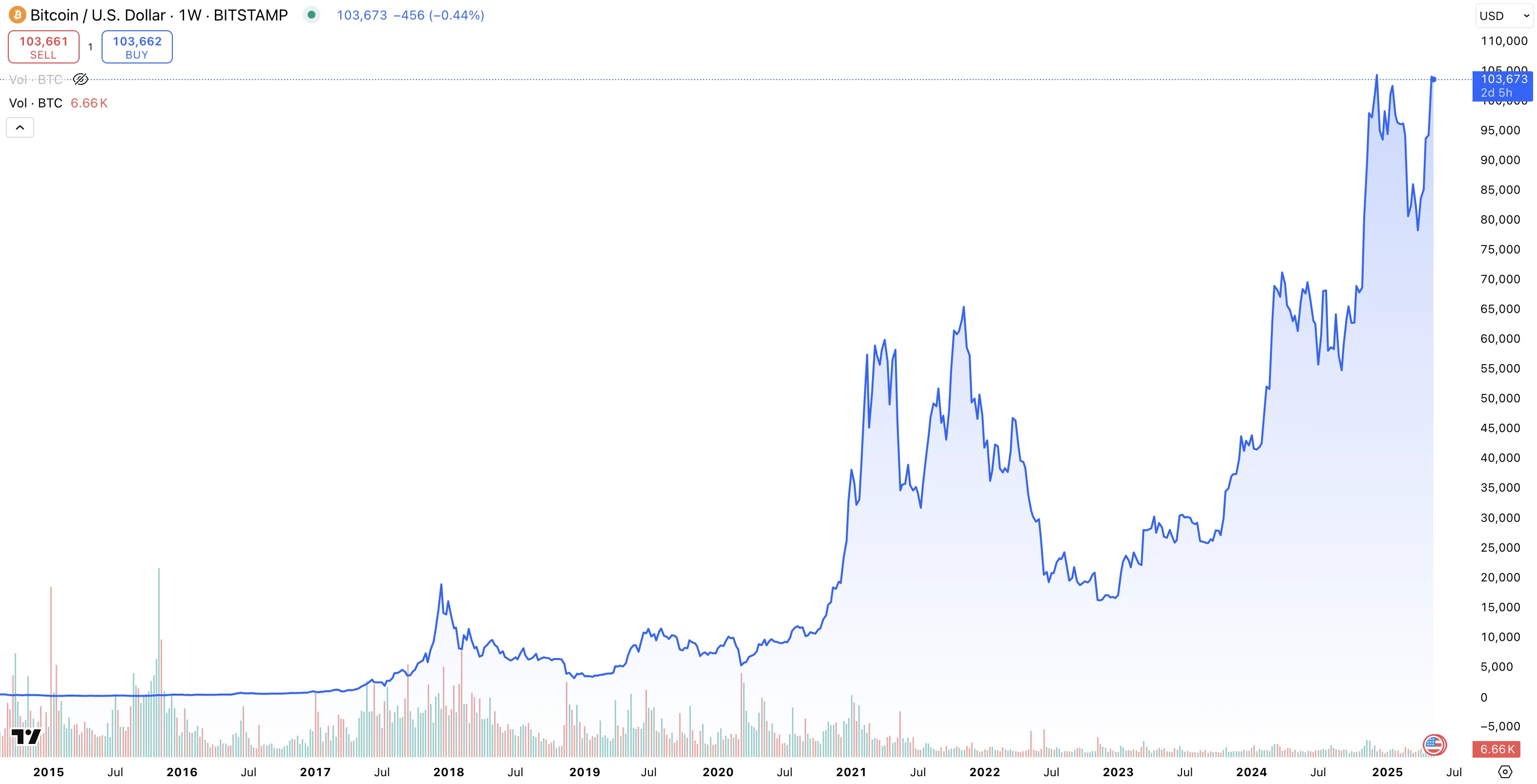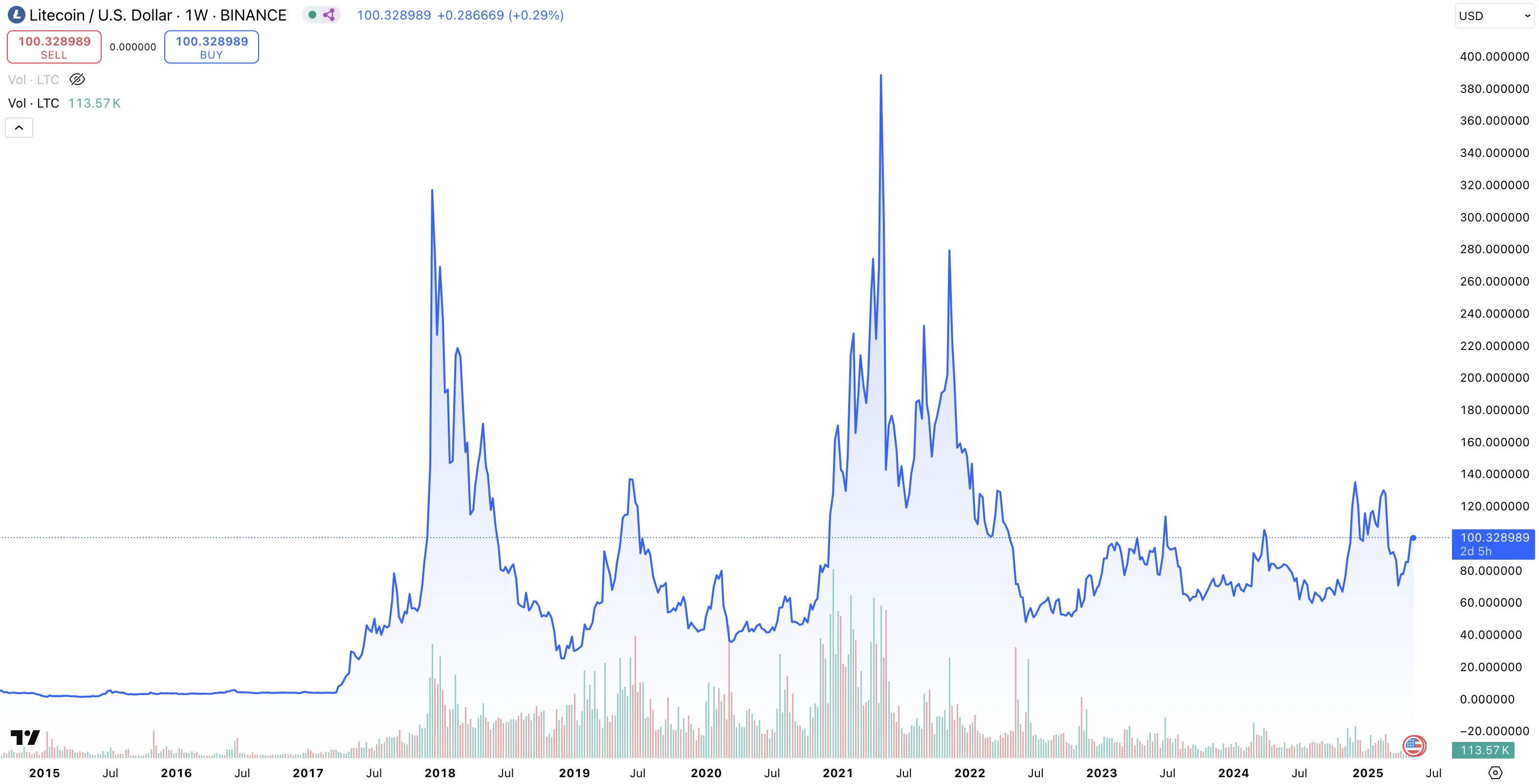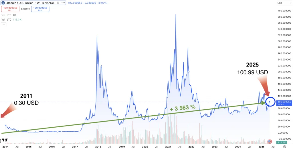 Grafen ovan visar litecoinkursens utveckling mellan 2013 och 2025. Till en början när Litecoin landerades, år 2011, handlades den till en kurs på omkring 0.30 USD. I mitten av 2025 uppgick kursen till 100.99 USD per coin. Det ger en total kursutveckling på 3 563 %, vilket är lika med en ackumulerad genomsnittlig avkastning på 29 % per år. Läs mer i kapitel 1 nedan.