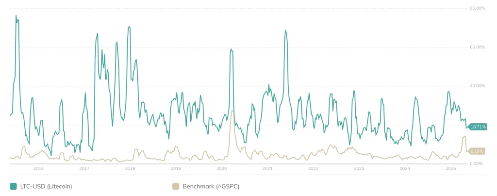 Som går att se har Litecoinkursen historiskt visat på en högre volatilitet än S&P 500. För en dag i mitten av 2025 låg Litecoinkursens volatilitet på 18.71 %. Samma dag låg S&P 500 volatilitet på 6.15 %. Den högre volatiliteten betyder att Litecoinkursen skiftade med mer procent, både upp och ner, under den utvalda tidsperioden.