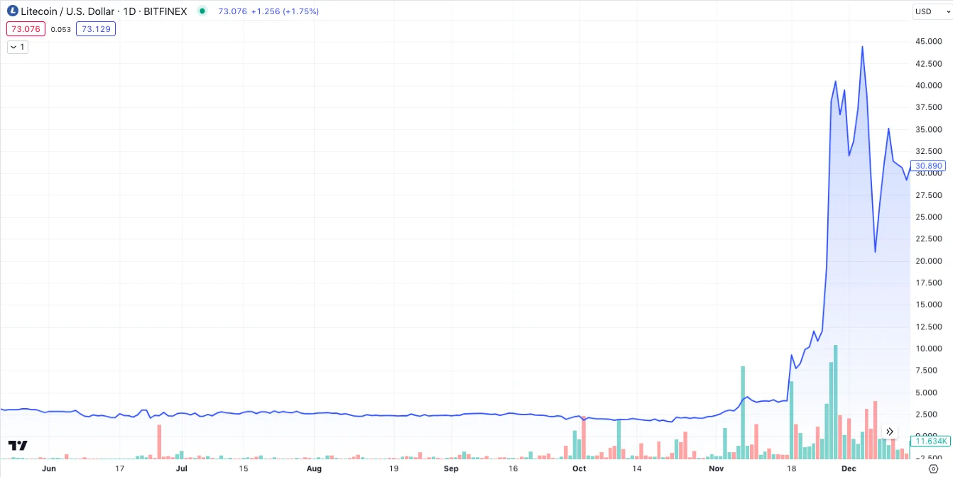 Litecoinkursen fick se sin första bull-run i slutet av år 2013. Inom loppet av två månader, mellan oktober och december, ökade kursen med cirka 2 550 %. Som högst nådde Litecoin en kurs på 44.73 USD. Anledningen till kursstegringen är flera.