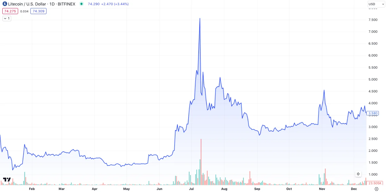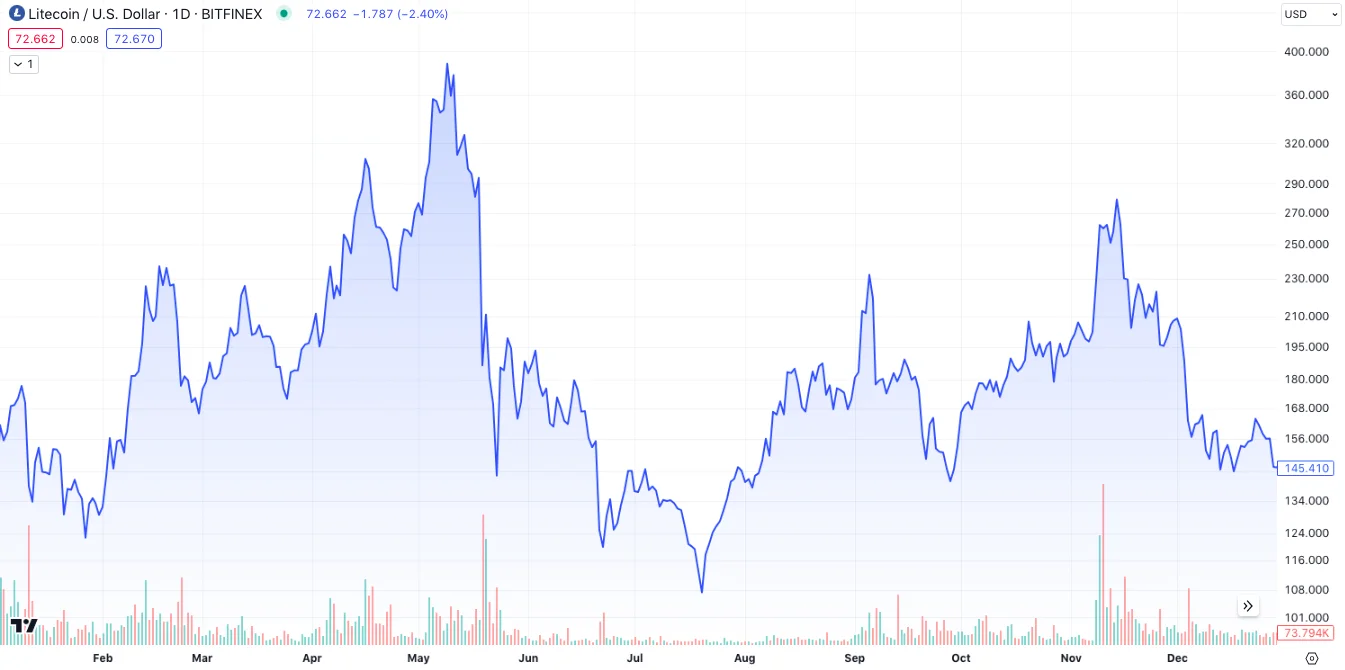 Som lägst noterade Litecoin en kurs på cirka 3.706 i januari år 2017. Som högst noterades en kurs på 358.34 USD i december samma år. Kursen ökade med andra ord ungefär 9 569 % på endast 1 år.