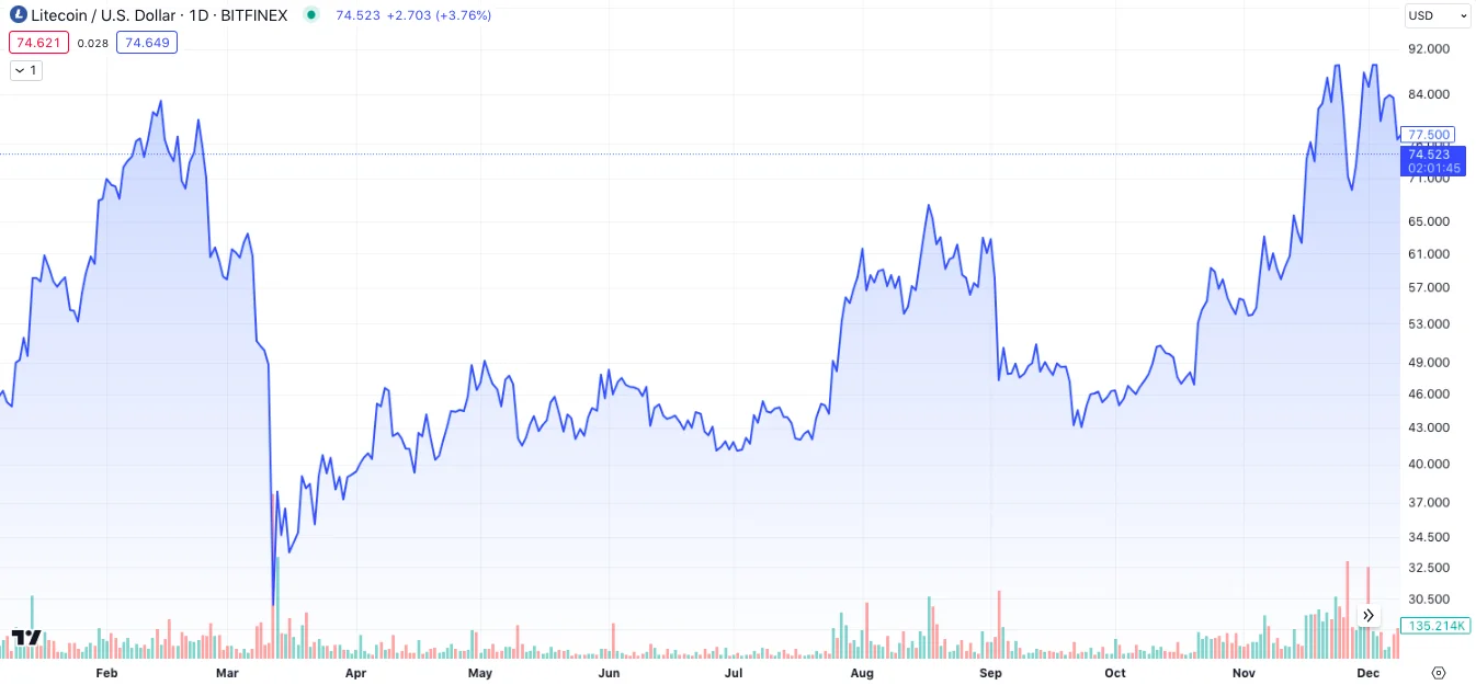 Andra halvan av 2020 kom att bli början på en lång och kraftfull “bull-market”. Från årslägsta på 30.171 USD steg Litecoinkursen till ett årshögsta på 89.243 USD. Det vill säga, en uppgång på ungefär 195.79 %. Denna uppåtstigande trend fortsatte även in på 2021.