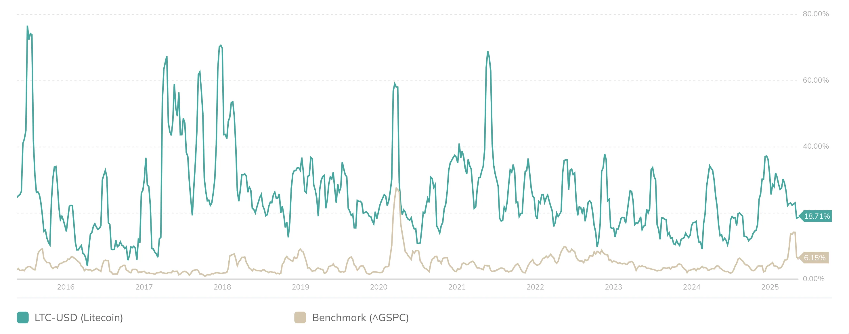 Historiskt har Litecoinkursen visat på en högre volatilitet än jämförelseindex S&P 500 (500 största bolagen i USA). Ovan visas ett volatilitetsdiagram för både Litecoin och S&P 500 under en 10-årsperiod, från slutet av 2015 till mitten av 2025. Litecoins volatilitet uppgick till 18.71 %, samtidigt som S&P 500 volatilitet låg på 6.15 %, år 2025. Läs mer i kapitel 2 nedan.