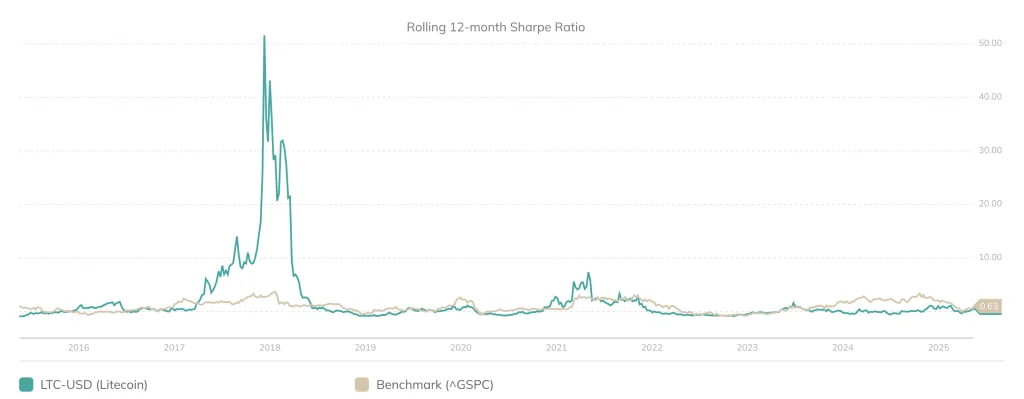 I mitten av 2025 låg Litecoins sharpekvot på 0.36. Sharpekvoten för jämförelseindex, S&P 500, låg under samma period på 0.63. Risken i förhållande till avkastningen är alltså högre för Litecoin än för S&P 500. Det betyder att Litecoin kan ses som en mer riskfylld investering än S&P 500.