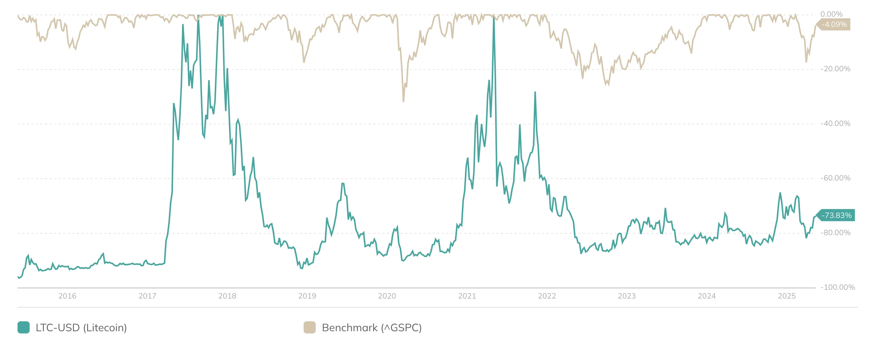 Diagrammet nedan visar den totala förlusten, räknat i procent, för både Litecoin (grön färg) och S&P 500 (orange färg) mellan 2015 och 2025.