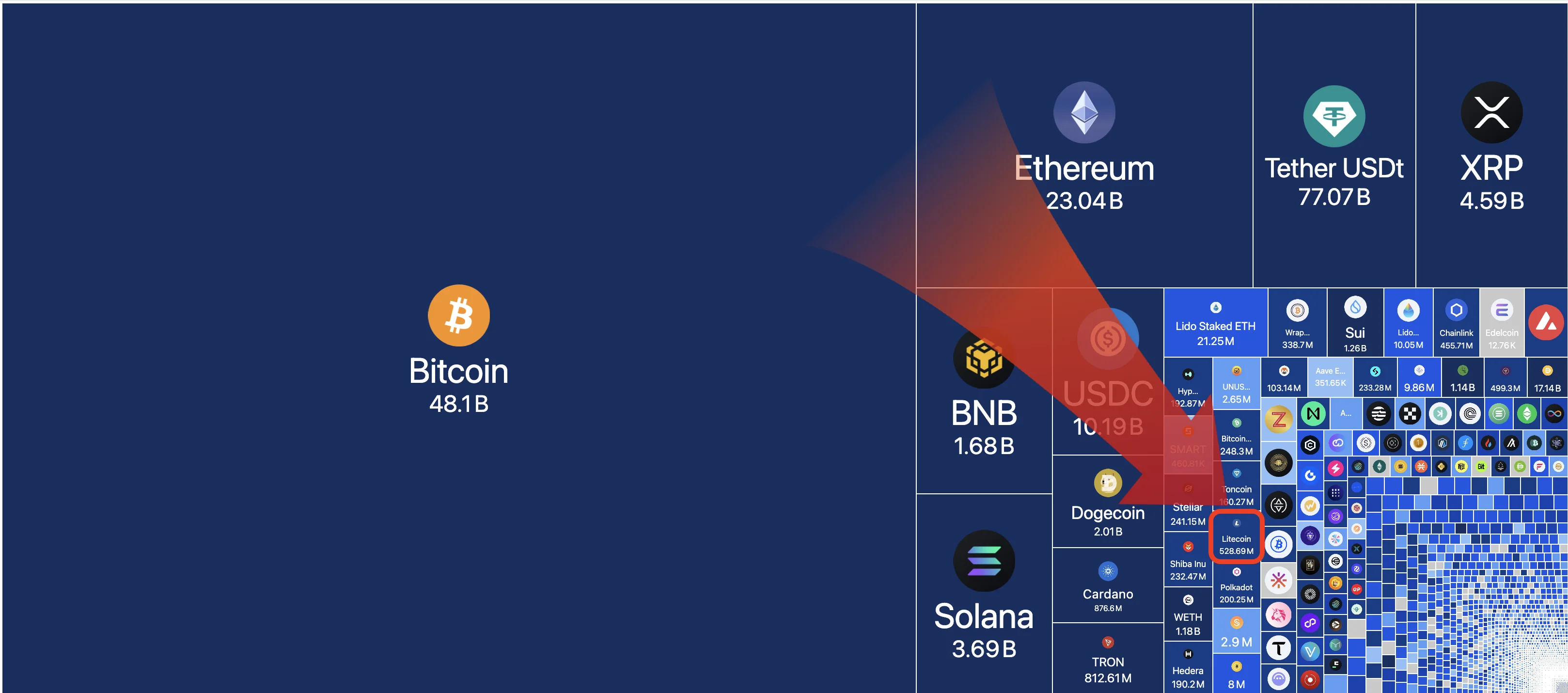 Nedan visas och jämförs de största kryptovalutorna baserat på deras marknadsvärde. Bilden är tagen i mitten av 2025. Litecoin är omringad med en röd markering och en pil som pekar mot den.