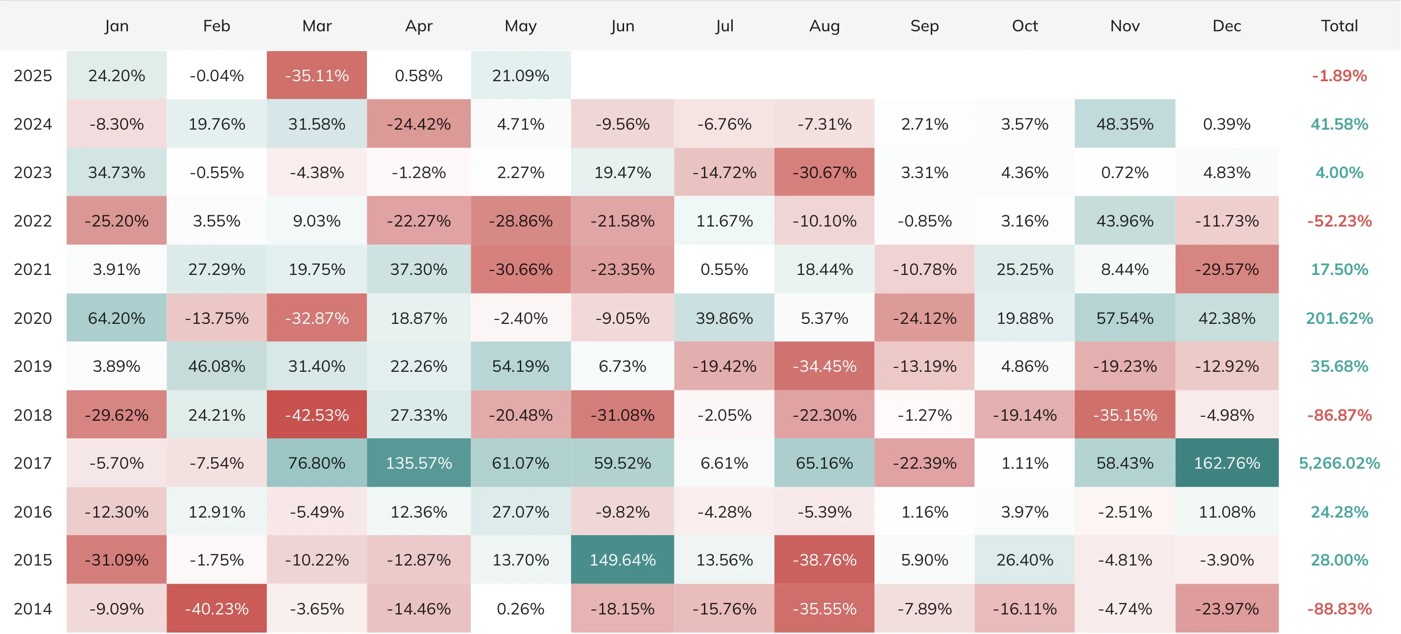 I följande kapitel presenteras statistik på Litecoins marknadsvärde, handelsvolym och månatlig avkastning. Informationen presenteras med hjälp av heatmaps som ger en mer användarvänlig upplevelse för att jämföra Litecoin mot andra kryptovalutor.