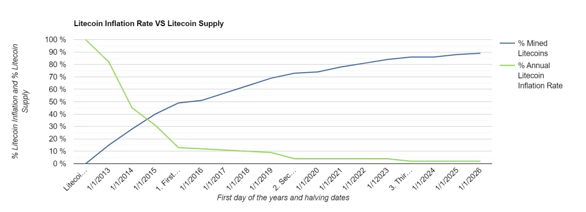 Det kommer som max att finnas 84 miljoner Litecoins. Den inbyggda inflationen uppgick i mitten av 2025 till 1.77 % per år.