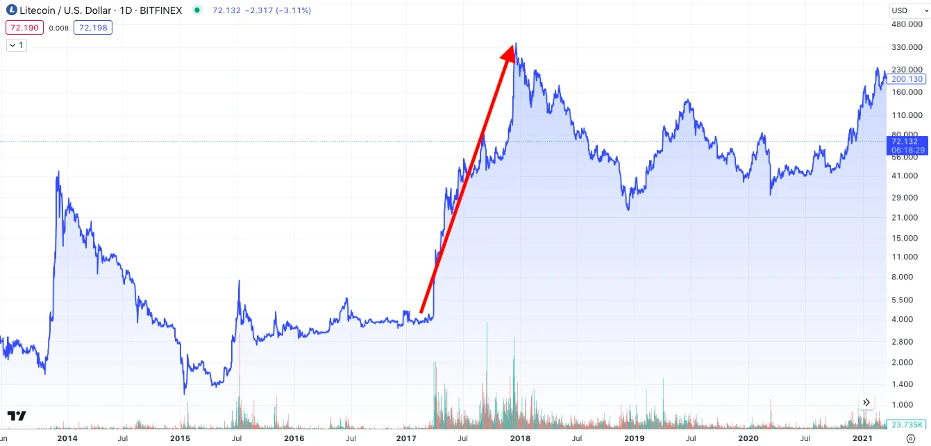 Kapital från privata investerare till krypto ökade kraftigt år 2017. Bitcoin, som den ledande kryptovalutan, upplevde en anmärkningsvärd ökning på cirka 1 800 %. Kursen steg från cirka 1 000 USD till 19 000 USD. Det ökade intresset för Bitcoin spred sig över resterande kryptovalutor och däribland Litecoin.
