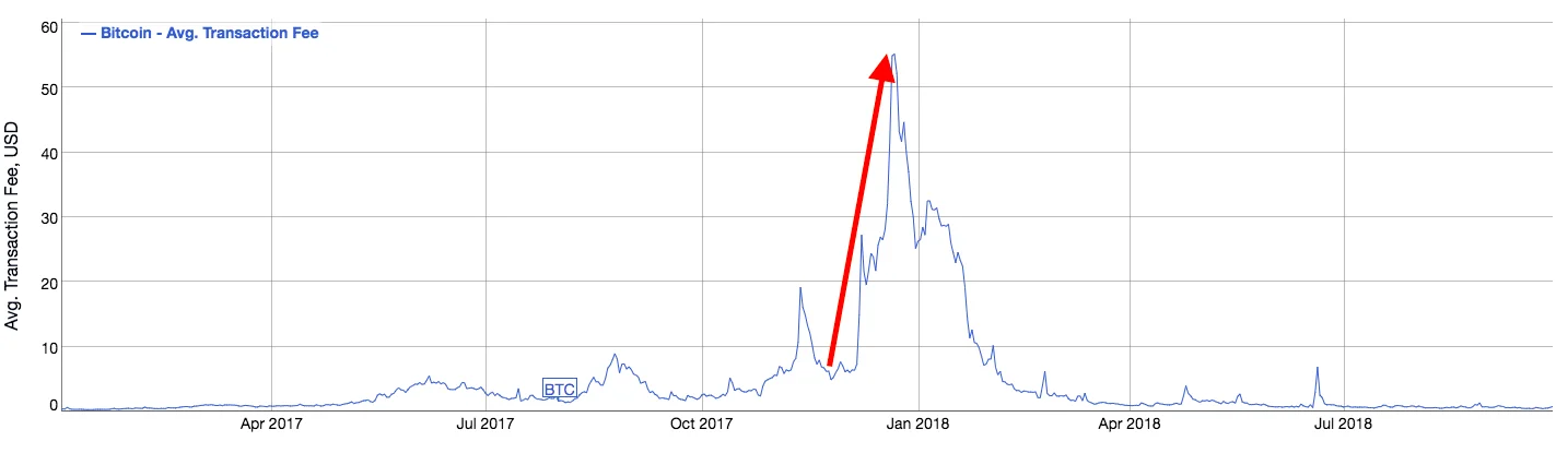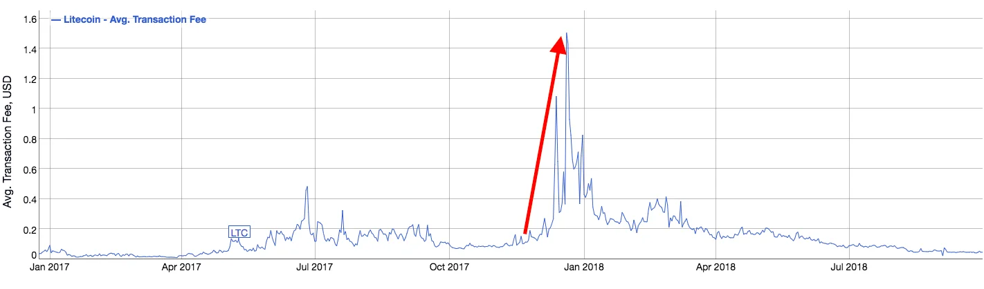 Den genomsnittliga transatioksavgfiten för Bitcoin låg som högst på över 50 USD per transaktion. Under samma period låg den genomsnittliga transaktionsavgiften för Litecoin nätverket på lite över 1.40 USD.