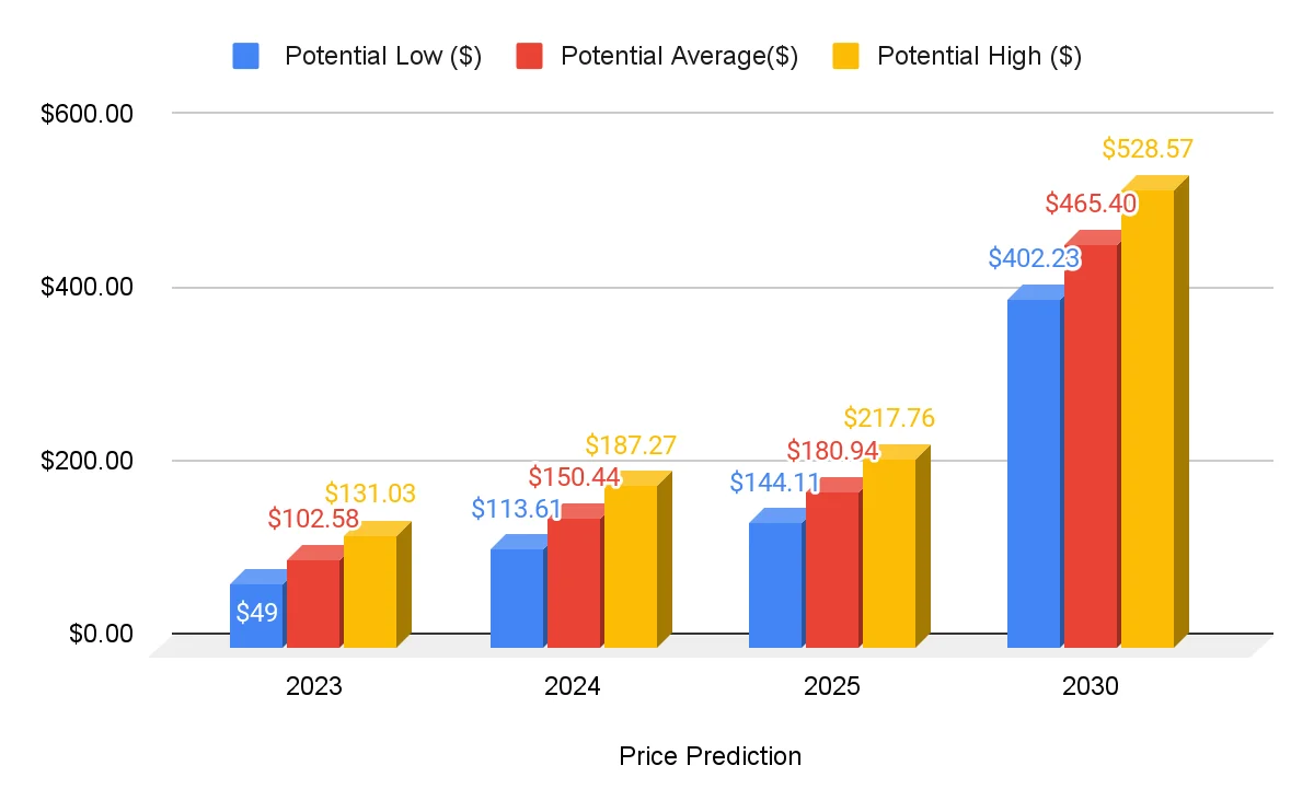 Grafen ovan bygger på prisprognoser från Coinpedia.org som förutspår tre olika “case” inför 2030. Enligt “worst case” kommer Litecoin att nå en kurs på cirka 402 USD. Enligt middle case och best case kommer kursen att kunna uppgå till cirka 465 USD, respektive 529 USD.