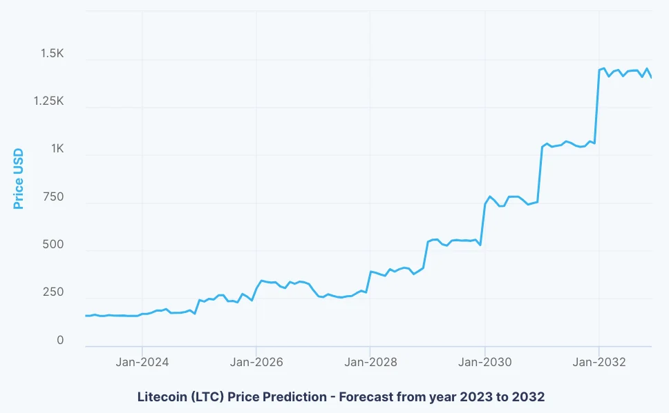 Enligt två källor (Coinpedia.org och Techopedia) spås Litecoinkursen stiga till mellan 402 USD och 863 USD. Det motsvarar ungefär 4 200 SEK och 9 000 SEK per coin. Grafen ovan visar prisprognoser gjorda av Coinpedia.org. Ytterligare en källa (Digitalcoinprice.com) spår att kursen kan komma att stiga till cirka 1450 USD år 2032. Det motsvarar ungefär 15 150 SEK. Läs mer i kapitel 5 nedan.