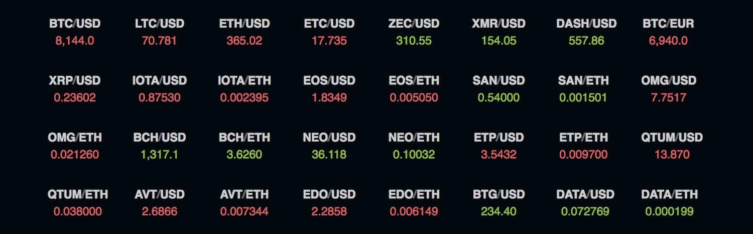 Du kan handla över 40 olika kryptovalutor och tokens hos Bitfinex. Dessutom tillkommer det ständigt nya kryptovalutor på handelsplatsen. Orderboken för att handla kryptovalutor är fullständigt transparent. Nedan har vi listat några av kryptovalutorna med tickersymbol som du kan handla: