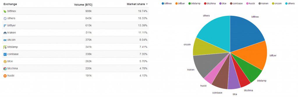 Om du är en trader förstår du hur viktigt det är med god likviditet på marknaden. Med låg handelsvolym ökar spreaden (skillnaden mellan köp- och säljpriset) vilket skapar en dold avgift. Bitfinex har varit den största Bitcoin-handelsplatsen (sett till volymen) sedan Kina (People’s Bank of China) införde obligatoriska avgifter under 2017. Nedan ser du handelsvolymen för bitcoin från Bitcoinity under det första kvartalet 2017: