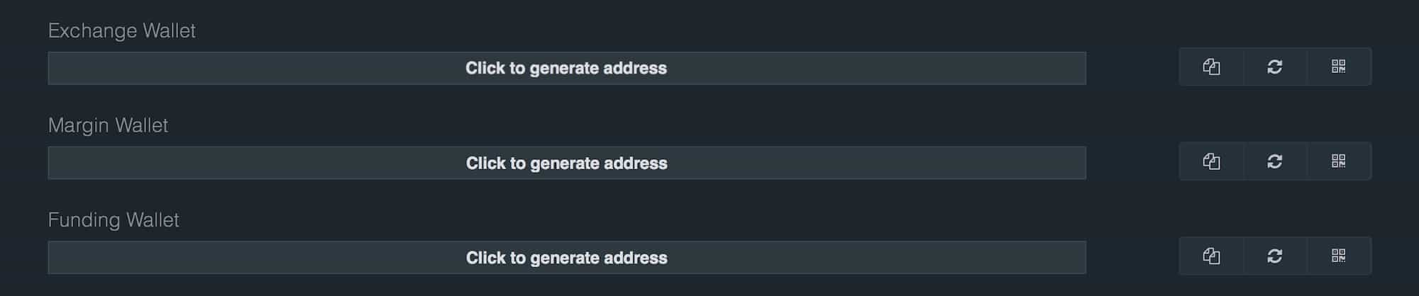När du har skapat konto och loggat in behöver du sätta in pengar. Navigera till ”Deposit” i navigationsmenyn och välj en valuta. Vi rekommenderar som sagt att du använder bitcoin eller någon kryptovaluta eftersom det är enklare, snabbare och anonymt. Var noga med att du väljer plånboken ”Exchange” när du överför kryptovalutor.