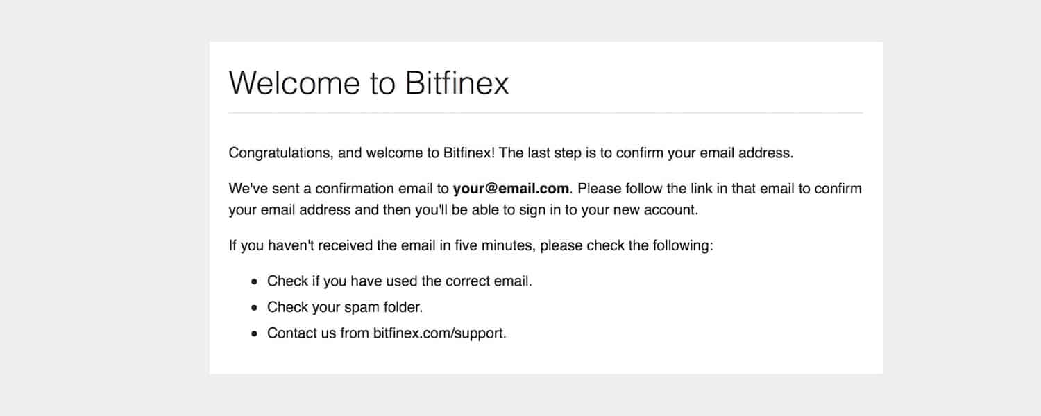 Det är enkelt och går snabbt att öppna konto på Bitfinex. Allt du behöver fylla i är användarnamn, e-postadress och lösenord. Du har också möjligheten att välja tidszon och fylla i ”Referrer Code” nedan för 10% rabatt på avgifter. Strax därefter kommer du få ett e-postmeddelande för att verifiera din e-post och slutföra registreringen. Öppna ett konto här och ange koden ”hbDrN2SQgS” för 10% rabatt på handelsavgifter under 30 dagar.