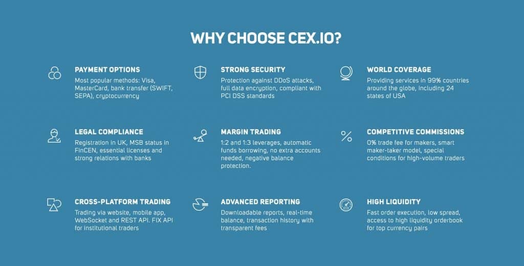 Som du ser på bilden ovan finns det många anledningar att välja CEX.io som handelsplats. Det finns flera bra användarfunktioner som andra handelsplatser inte erbjuder. Men det finns inte bara fördelar utan också nackdelar. I slutet av recensionen har vi listat för- och nackdelar. Nedan går vi igenom några fördelar och användarfunktioner i detalj: