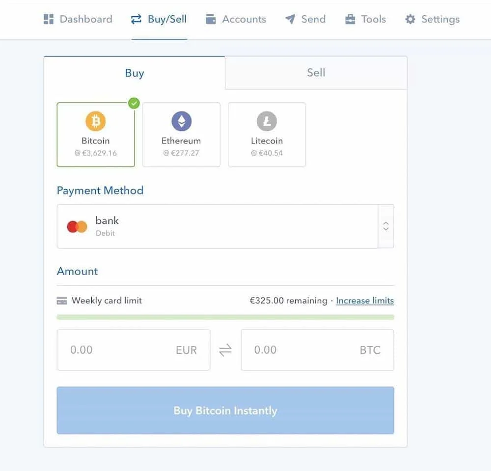 Européer kan överföra pengar med SEPA banköverföringar som blir tillgänliga efter 1-3 dagar. Det är gratis med banköverföringar men Coinbase tar sedan en avgift på 1.49% när du köper. Annars kan du köpa bitcoin direkt med ditt kredit/bankkort vilket blir 3.99% i avgift. Du behöver skicka in en bild på ditt körkort eller pass om du ska betala med kredit/bankkort. Köpgränsen beror på hur mycket information du har verifierat på ditt konto. Om du har verifierat alla uppgifter kan du köpa för max €30,000 vilket är det högsta tillåtna beloppet på kontot.