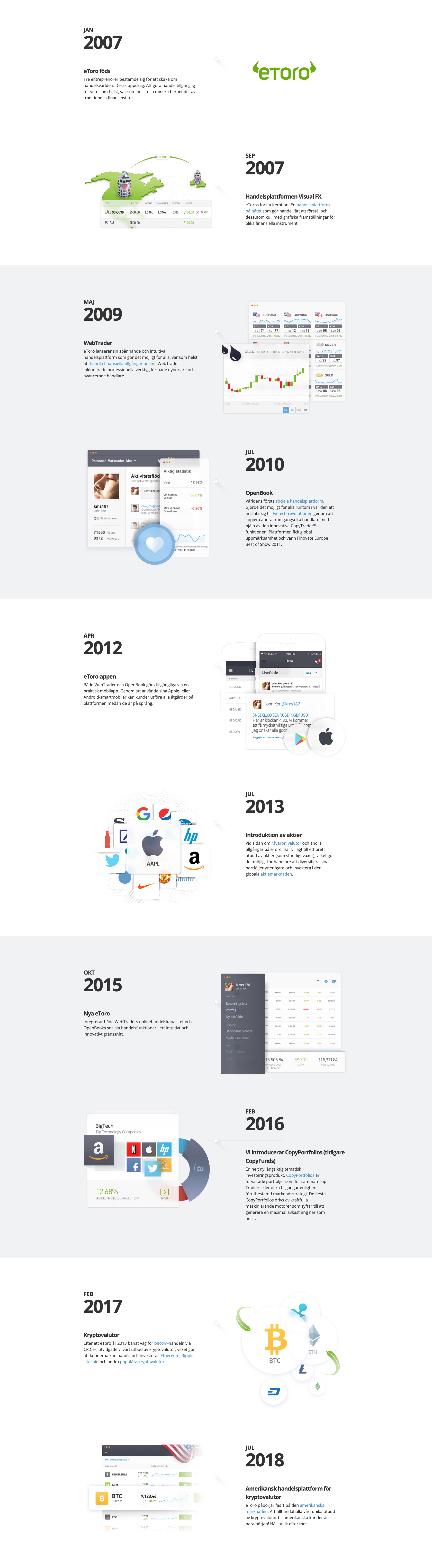 Det har tagit 13 år av utveckling för eToro att nå dit de är idag. Företaget har gått från att bara vara en vision om att göra investering och valutahandel tillgänglig för gemene man, till att idag vara en plattform som brukas av miljoner människor världen över. eToro har lyckats med sin vision och byggt en av Europas största handelsplatser.