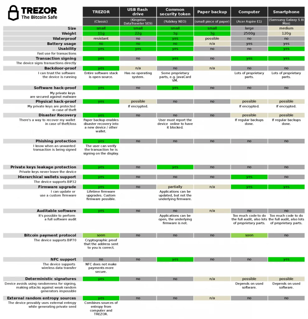 Dock uppstod klagomål eftersom mjukvaruuppdateringen som behövdes för att stödja Bcash blev försenad. Enligt oss skötte sig företaget bra under omständigheterna och kunderna behandlades rättvist. Trezor hade lika gärna kunnat säga att deras hårdvaruplånbok inte stödjer Bcash. Trezor wallet fungerar tillsammans med Windows, macOS och Linux. Nedan har vi listat plånböcker och deras kompatibla användarfunktioner: